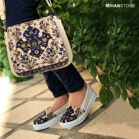 فرهنگ و تمدن هر کشوری نشان دهنده اصالت و قدمت آن است. امروزه مردم کشورهای غربی با چنگ و دندان پاسدار فرهنگ نه چندان قدمتدار خود هستند آنجا که ایران ما دارنده فرهنگی عمیق پر از نقش و نگار و خصوصیات اخلاقی ویژه است. این ست کیف و کفش علاوه بر جادار بودن کیف، و کفش فوق العاده راحت دارای نقش و نگاری است که برگرفته از فرهنگ ایرانی است. زیبایی این طرح نه تنها در ایران بلکه در تمام دنیا مورد پسند همگان است و زیبایی و جذابیت خاصی دارد که تحسین همگان را بر می انگیزد. کفش این ست در سایزبندی 37 الی 40 عرضه شده است که هنگام تکمیل فرم سفارش می توانید سایز مورد نظر را انتخاب کنید.